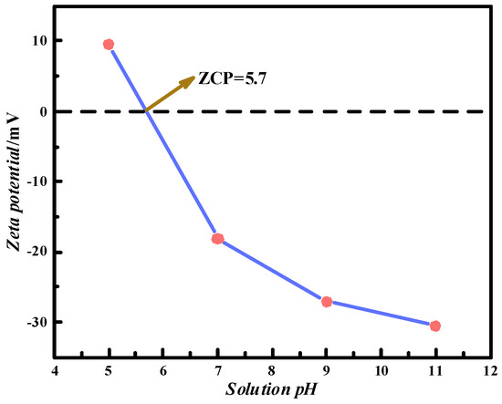 Zeta-potential measurements are taken to better illustrate the role of the adsorbent in the adsorption of MB. Figure 5 shows the zero-charge point (ZCP) of nZVI@H at pH 5.7. As a result, the surface of nZVI@H will be positively charged at a pH less than 5.7 and negatively charged at a pH greater than 5.7. This reflects the fact that the negative charge on the nZVI@H surface favors the adsorption of positively charged cationic dyes such as MB at pH > 5.7. In contrast, at pH < 5.7, the surface of nZVI@H has a positive charge, causing electrostatic repulsion between the two particles of nZVI@H and MB.