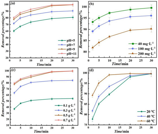 Figure 7d shows that the final removal percentages of MB are 99.6%, 99.7%, and 99.7%, respectively. In the 20 min of the reaction, the removal percentage of MB increased with increasing temperature, and the adsorption amounts were 73.48 mg·g−1, 75.68 mg·g−1, and 79.76 mg·g−1. This indicates that the adsorption capability of nZVI@H increases as temperature rises (an increase from 20 °C to 60 °C). It also confirms the endothermic character of the adsorption reaction. With temperature increases, the activation energy barrier decreases the increased rate of diffusion of MB molecules into adsorbent, thus increasing the adsorption rate and the adsorption capacity [34,35]. However, because adsorption is close to equilibrium, the final removal rate shows no significant difference between the different temperatures.