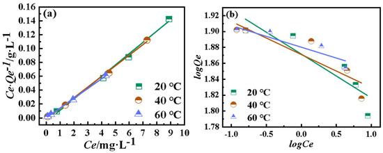 Linear fitting of (a) Langmuir model and (b) Freundlich model.