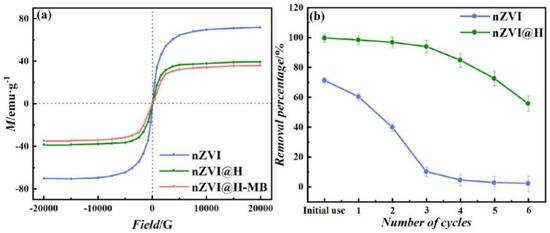 Figure 11a shows the results of magnetic detection of bare nZVI and nZVI@H using VSM. From (a), it can be seen that the saturation magnetization intensity of nZVI@H formed through the combination of magnetic nZVI with non-magnetic hydrotalcite decreased by nearly half (from 72.50 emu·g−1 to 39.36 emu·g−1). This confirms the SEM results that hydrotalcite contributes to the reduction of the magnetic properties of nZVI and the reduction of nZVI agglomeration. In addition, the coercivity magnetization of nZVI@H is above 20 G, which proves that it is a soft ferromagnetic material. Figure 11b shows the results of the repeated use experiment (6 cycles) of nZVI with nZVI@H. At the initial use, the removal rates of MB by nZVI and nZVI@H are 71.2% and 99.6%, respectively. Apparently, after three cycles, the removal rate of nZVI decreases to 10.1%, while nZVI@H can maintain a 93.9% rate. After six cycles, nZVI@H still has more than half of the removal rate, and this result suggests that nZVI@H has excellent stability and reusability. Furthermore, the material remains magnetic following cycles (nZVI@H-MB in Figure 11a), creating conditions for subsequent nZVI@H recycling and reuse.