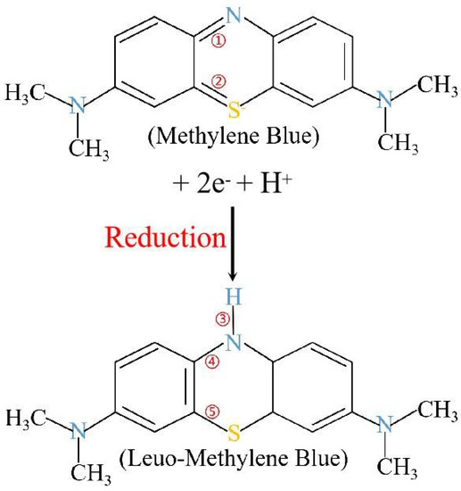 Removal of MB from the solution is closely related to redox reactions, chemical adsorption and precipitation processes [28]. The removal process of MB involves the oxidation of Fe0 (Equation (8)) followed by the chemical reduction of MB [42]. MB obtains electrons emitted from Fe0 and turns itself into colorless leuco-methylene blue (LMB) (Figure 12). This is consistent with the kinetic analysis. As shown in Figure 12, the bond energies of ①~⑤ are 615, 536, 389, 305, and 272 kJ·mol−1, respectively. The C=N and C=S with high-bond energies are broken into C–N and C–S with low-bond energies by the release of electrons from the Fe0. At the same time, the N in the MB molecule forms a bond with the H+ in the water (N–H) to produce the LMB. It is the main reason for the decolorization of the dye. Then a series of small molecular substances are generated and separated using adsorption coprecipitation through the following reactions (Equations (10)–(13)):
