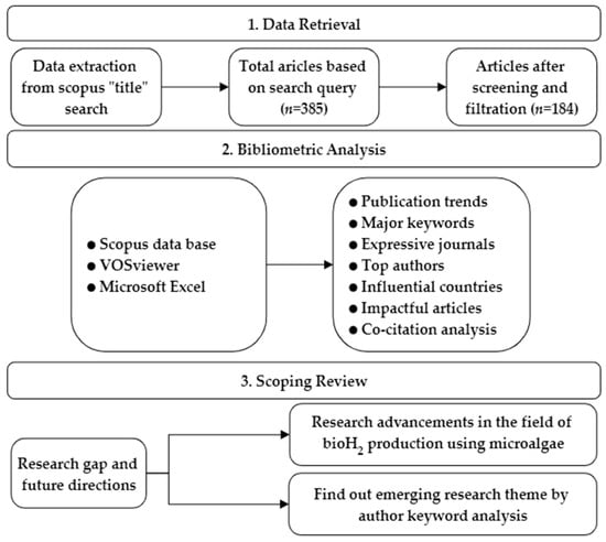 The results presented in this paper are based on a bibliometric analysis of articles published between 2000 and 2022 on bioH2 production from microalgae. The analysis uses information from the published literature to answer the research questions, find research trends, identify research gaps, and identify future research directions. In addition, a scoping review of highly cited articles and recent publications helped outline recent advancements. Figure 2 shows the framework for the bibliometric analysis.