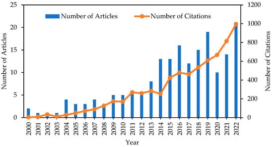 The Scopus database was employed to elucidate articles with the highest citations, identify publication trends, and extract the keywords. The evaluation of journals and countries was based on total publications (TP), total citations (TC), and the citations per publication (CPP). TP can indicate a journal or country’s contribution to the research area, while TC can represent the relevance and the quality of the papers published. CPP can assess the consistency of contribution to knowledge. Moreover, for the top authors, the ranking was performed using a normalized citation score. It is the total number of citations of a particular publication in relation to the average number of citations of all the publications in the same year. Leading articles were ranked using local and global citation scores. Global citations are the total number of citations across all indexing databases, whereas local citations are those inside the selected 184 articles. Co-authorship between countries was highlighted by a visualization map to determine which research collaborations are the strongest. Co-citation analysis was performed by a network map. In addition, visualization of keywords and their number of occurrences was also carried out. Furthermore, a scoping review of articles was conducted to highlight recent advancements and identify future research recommendations.
