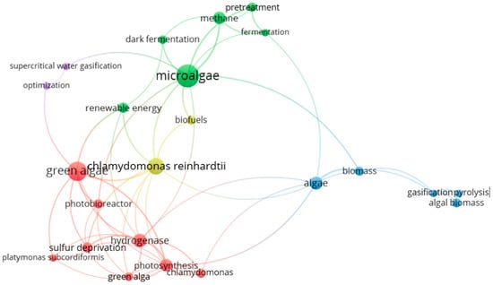 The main keyword “microalgae” in the green cluster links with several significant keywords related with techniques to produce bioH2 using microalgae, such as “dark fermentation” and “fermentation”. Other keywords present in the same cluster are “pretreatment” and “methane”, which are related to the fermentation technique. BioH2 production from microalgae by fermentation has considerably increased by applying various pretreatment technologies [25]. Both violet and blue clusters have keywords related to different techniques to produce bioH2 using microalgae, such as “supercritical gasification”, “pyrolysis”, and “gasification”. Similarly, “green algae” in the red cluster links with different themes, such as “H2ase”, “sulfur deprivation”, “photobioreactor”, and “photosynthesis”, which are the other factors affecting bioH2 production using microalgae [15]. Among these, H2ase and sulfur deprivation are critical factors. Several studies focused on optimizing factors and techniques related to bioH2 production using microalgae [44,45]. The red and yellow cluster algae contain keywords related to microalgae strains such as “Platymonas subcordiformis” and “Chlamydomonas reinhardtii”. These two belong to the division Chlorophyta of green algae. Early research was more focused on Chlamydomonas reinhardtii [18,40]. It can be inferred that green, blue, and violet clusters are primarily associated with the techniques used to produce bioH2 using microalgae. The red and yellow clusters focus on the factors affecting bioH2 production and investigate microalgae strains.