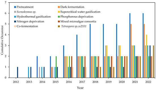 Many keywords emerged in the last decade and have shown an increasing trend, as shown in Figure 5. Nitrogen deprivation had lower occurrences; however, a recent increase indicates it emerged as a critical factor in bioH2 yield. However, phosphorous deprivation has yet to be thoroughly explored. Several studies investigated the effects of different pretreatment methods such as autoclave, ultrasonication, ammonia, microwave, and electrolysis in H2 generation. These methods increase the solubilization and liberation of available organic material such as sugars, proteins, and lipids from algal cells, so H2 production performance is enhanced [15,46,47,48]. Dark fermentation showed a significantly increasing trend of occurrences, indicating the focus on achieving higher bioH2 yield by applying pretreatment techniques. Tetraspora sp. CU2551 had a significant increase even though it only appeared since 2018. Mixed microalgae consortia and co-fermentation showed similar growing behavior, indicating their strong correlation. Hydrothermal gasification has not advanced in bioH2 production compared to supercritical water gasification.