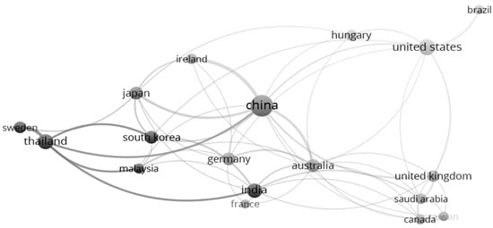 Country authorship analysis was conducted with a minimum of five co-authored publications per country. Out of the 47 identified countries, 18 met the criterion, as presented in Figure 6. The round nodes represent the total number of publications for each country. The larger the number of publications, the bigger the size of the bubble. The co-authorship among these countries is depicted by the curved lines that connect one country to another. Moreover, the thickness of the lines illustrates the term recurrence between the countries. Notable collaborations exist between China and Ireland, with a link strength of 8. The collaborative articles between these two countries mainly discuss co-fermentation and novel pretreatment methods. The second highest collaboration was between China and Australia and China and Japan, with a link strength of 5. The rest of the countries exhibit low co-authorship of 3 links or less. Most countries (such as China, the USA, and India) which focus on bioH2 production had total GHG emissions of more than 14 gigatons of CO2 equivalent (GtCO2e), 5 GtCO2e, and 3 GtCO2e in 2020 [63].
