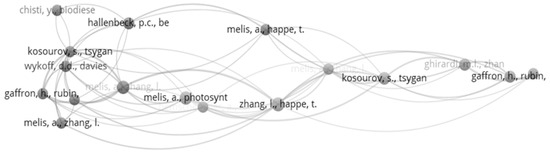 Furthermore, a co-authorship map was created between the authors, with the minimum number of documents being 3. This resulted in 53 authors meeting this criterion out of a total of 687. However, 33 authors were excluded from the analysis as no links were found among them. The most significant collaboration was between Mei Zhao (Jiangnan University, China) and Ruan Wunquan (Jiangnan University, China), Maria Lucia Ghirardi (National Renewable Energy Laboratory, USA) and Michael Seibert (National Renewable Energy Laboratory, USA), and Valeria Nagy (Institute of Plant Biology, Hungary) and Szilvia Z Toth (Institute of Plant Biology, Hungary). All the co-authorship was among authors from the same university. This hints that even though collaborations exist between countries, as shown in Figure 6, these are between different authors, not amounting to the threshold of 3 co-authored publications.