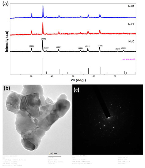 where d refers to inter planar spacing and h, k, and l are corresponding Miller indices. The calculated values of lattice parameters are 8.3346, 8.3697, and 8.3508 Å for Nd0, Nd1, and Nd2, respectively. The lattice constant value of the doped Ni-Zn ferrite sample is slightly higher than that of unsubstituted Ni-Zn ferrite samples. The reason for this is that the ionic radii of Nd3+ ion (1.16 Å) is higher than the Fe3+ ion (0.78 Å) and Zn2+ ion (0.82 Å). The replacement of larger ionic radii with slightly less ionic radii results in an increase of lattice parameters [49]. Furthermore, TEM analysis was performed for Nd2 sample and presented in Figure 1b. TEM image confirmed that the particles reside in nano dimensions and supported the observed XRD results. Moreover, SAED pattern (Figure 1c) (selected area electron diffraction) shows the bright and regular spots, which reveal the highly crystalline nature of Nd2 sample.