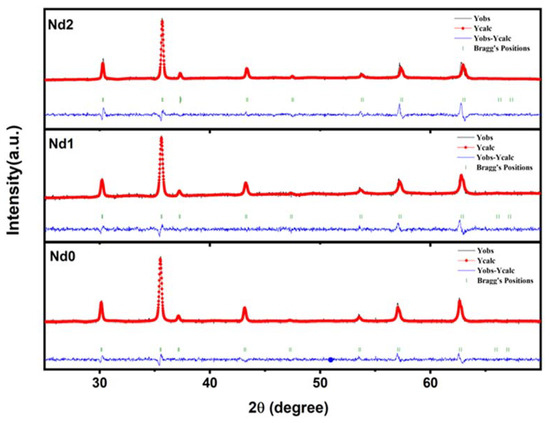 Rietveld refined XRD pattern of Nd0, Nd1, and Nd2 samples.