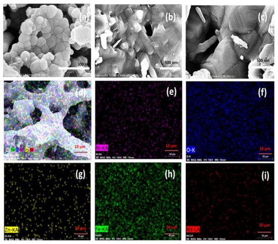 The morphology of the surfaces of synthesized catalysts was analyzed by scanning the surfaces of the catalysts using a scanning electron microscope. Figure 3a–c shows the recorded scanning electron micrographs for synthesized nano ferrite samples. Morphology of bare Ni-Zn ferrite sample exhibits the roughly spherical shaped grains. The Nd0 sample exhibits uniform particle size distribution in comparison to other samples. However, Nd1 and Nd2 sample shows quite stacked structure of grains. Nd substitution has resulted in changed morphology in the host Ni-Zn ferrite matrix. Besides morphology, dopant confirmation is done by analyzing elemental mapping. Figure 3d–i presents the elemental images for Nd2 sample. Mapping micrographs reveals the uniform distribution of Ni, Zn, Nd, Fe, and O elements for Nd2 sample.