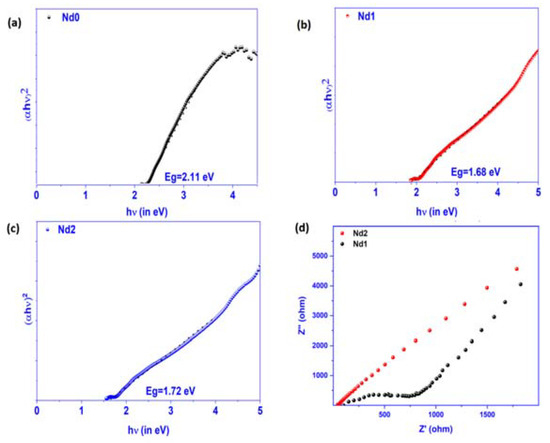 (a–c) Tauc’s plot for Nd0, Nd1, and Nd2 samples, (d) EIS spectra for Nd1 and Nd2 catalysts.