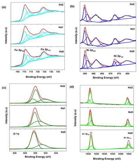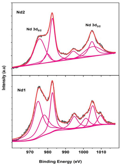 The valence state information shows a surprising significance in influencing the charge transport behavior of the photo catalysts, thus likewise altering their degradation efficiencies. In this view, all the samples have been characterized with X-ray photoelectron spectroscopy for further investigation. Figure 5a presents the de-convoluted Fe 2p spectra for all synthesized samples. Fe 2p spectra for all samples mainly possessed two main peaks assigned to Fe 2p3/2 and Fe 2p1/2 which arises due to spin orbit coupling along with their shoulder peaks. The major peaks are further sub-divided into other peaks. For Nd0 sample, the lower binding energy Fe 2p3/2 peaks are located at 710.45 and 712.33 eV, respectively. The observed peaks’ position matches well with the reported values showing two different environments of Fe states, i.e., octahedral as well as tetrahedral. The observed peak at 724.39 eV is assigned to Fe 2p1/2 state. These peak positions are in close agreement with the previously reported values for Fe3+ states [52]. The other observed peaks at 717.46 and 731.60 eV are referred to as shoulder peaks associated with spin coupling splitter states. However, the positions of all major peaks corresponding to 3/2 and ½ states take a slight leftward shift for Nd1 and Nd2 samples. The results indicate that Nd substitution may promote the creation of the Fe2+ state along with the Fe3+ state in the samples. The exact contributions of Nd substitution on Ni environment have been further analyzed by de-convoluting Ni 2p spectra, as shown in Figure 5b. The observed peaks at 854.80 and 872.34 eV correspond to the Ni 2p3/2 and Ni 2p1/2 states confirming the Ni3+ state of the Nd0 sample. Peaks residing at 856.57 and 873.97 eV signify the presence of Ni2+ state. Other peaks are satellite peaks associated with 3/2 and ½ states of Ni 2p. Ni is confirmed to have mixed valence state for Nd0 catalyst, which can serve as source for carriers in redox reactions during catalysis. A minor shifting of peak positions takes place in Nd substituted samples. Such a pattern is expected as Nd has made changes in the Ni-Zn ferrite matrix. The presence of any oxygen-related defects inside the catalyst is also investigated using de-convoluted oxygen 1s spectra (Figure 5c). The Nd0, O1s spectra are a combination of two peaks at 529.68 and 531.22 eV. The low binding energy peak is the characteristic peak of the metal-oxygen bond, and the higher binding energy peak corresponds to the loosely bound oxygen or adsorbed oxygen on the surface of the catalyst [53]. Similar behavior is observed for Nd1 sample with slight shift of characteristic peak on higher binding energy side. The spectra obtained for Nd2 are, however, slightly different and fitted with an additional peak. In addition to the low and higher energy peaks, the mid-energy peak is situated at 530.14 eV. This peak is attributed to the presence of oxygen vacancies in the catalyst. The results indicate that the Nd2 catalyst contains oxygen vacancies and has adsorbed oxygen on its surface. The Zn 2p spectra are also examined for any changes in the Zn environment caused by Nd substitution. Zn 2p spectra are fitted with two major and two minor peaks, indicating two different environments of Zn ions in all samples, which might be due to the tetrahedral and octahedral environment in the cubic structure of ferrites (Figure 5d). It is necessary to probe the valence state and environment of Nd ions also. Nd 3d fitted XPS spectra are shown in Figure 6. Nd 3d5/2 spectra are fitted with three peaks for both Nd1 and Nd2 samples. In general, Nd3+ peak occurs at 982.50 eV, while Nd2+ resides at 980.30 eV [54]. The peaks observed at 982.64 and 882.67 eV confirm the presence of Nd3+ in both the samples. In case of Nd substituted Zn ferrite nanoparticles, Nd 3d5/2 and Nd 3d3/2 have been reported to occur at 981.1 and 1003.2 eV, respectively [55]. The peak observed at 980.10 eV indicates the presence of the Ni2+ state in the Nd2 sample. According to the literature, the characteristic peak of metallic Nd (Nd clusters) occurs at 980.9 eV, implying that there is no metallic Nd or Nd-Nd environment in either sample. Such results deny the presence of any secondary phases in either of the samples. All observed binding energies are listed in Table 2. In short, XPS analysis confirms the presence of mixed valence states of Ni and Fe in both Nd doped catalysts and mixed valence states of Nd in the Nd2 catalyst. The presence of mixed valence states may coordinate the charge transfer of carriers and play a significant role in redox reactions.