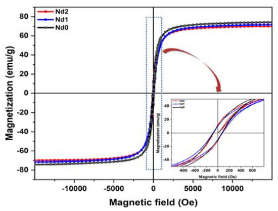 A photocatalyst’s strong magnetic behavior is one of its most desirable characteristics. The photocatalyst’s magnetic property facilitates recovery and makes it usable after the degradation process over the cycles. Ferrites’ magnetic nature makes them suitable to act as magnetically separable photo catalysts and dominate other catalysts that are hard to recover. The magnetic properties of the catalysts are analyzed by recording hysteresis loops (M-H) for the catalyst powder. The experiment is performed at room temperature under the application of 15,000 Oe magnetic field strength. Figure 7 show presents the room temperature magnetization versus field curve for synthesized catalysts. All samples exhibit well saturated hysteresis loops. The saturation magnetization (Ms) values obtained are 71.30, 67.18, and 65.32 emu/g for Nd0, Nd1, and Nd2, respectively. The coercive field (Hc) values are 74.15, 83.19, and 72.17 Oe, respectively. However, the retentivity (Mr) value shows an increasing trend and the observed values are 10.12, 11.26, and 12.52 emu/g for Nd0, Nd1, and Nd2 respectively. The decrease in the saturation magnetization with Nd doping was recently observed by Qian et al. [56]. The magnetic properties of the nanomaterials depend on a number of factors, such as the distribution of cations at respective sites, crystallite size, starin developed in the crystal, and also the anisotropic properties of materials [57]. Even the properties may vary for nanoparticles synthesized using different synthesis routes. The magnetic properties of the ferrites are attributed to the super-exchange interactions resulting from the interactions among the metal ions and mediating oxygen ions [58]. The interaction will lead to the alignment of the spins of ions in antiparallel or parallel way on A (tetrahedral) or B (octahedral) sites and AA or BB sites, respectively. The resulting net difference between the magnetic moments is given by: