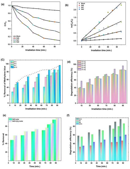 - Hammouche, J.; Gaidi, M.; Columbus, S.; Omari, M. Enhanced Photocatalytic Performance of Zinc Ferrite Nanocomposites for Degrading Methylene Blue: Effect of Nickel Doping Concentration. J. Inorg. Organomet. Polym. Mater. 2021, 31, 3496–3504. [Google Scholar] [CrossRef]