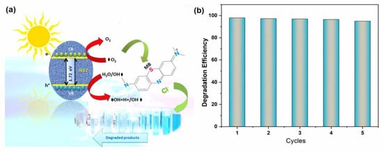 (a) Proposed mechanism for solar driven degradation of methylene blue using Nd2 catalyst, (b) Reusability of Nd2 catalyst over five successive cycles.