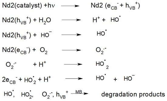The photo catalytic removal of methylene blue under solar light is also tested in the presence of H2O2. The obtained results are shown in Figure 8e. The observed results indicate that under solar light, Nd2 + H2O2 catalyst system is highly efficient for the degradation of MB as 98% degradation is observed under these reaction conditions. This behavior directs us to believe in more hydroxyl radical generation through the photo-Fenton reactions. However, this contribution is small as the proposed catalyst is quite efficient without the presence of H2O2. Scheme 2 shows some of the feasible reactions which take place in the presence of H2O2.