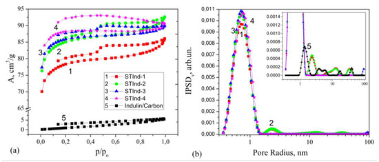 (a) Nitrogen adsorption–desorption isotherms and (b) pore size distributions of 1: STInd–1; 2: STInd–2; 3: STInd–3; 4: STInd–4; and 5: indulin/carbon.