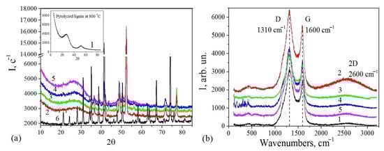 The formation of Zn and Mn ferrite phases as well as Al2O3, MgO, and Ca2SiO4 (as was reported by Li et al. [41]) cannot be precisely established to see the crystalline compounds due to the sensitivity of this method and their very low content. As shown in Figure 2a (insertion), the pyrolyzed lignin is amorphous due to the presence of two broad and non-intense maxima of the halo at around 2θ = 26° and 50° in the pattern that is characteristic of amorphous carbon.