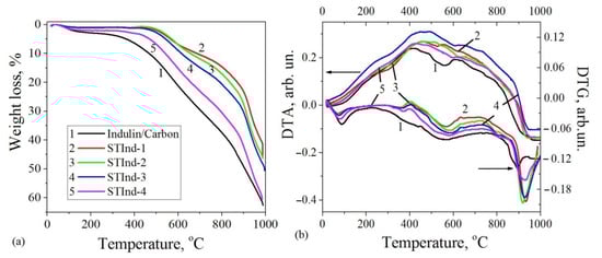 The DTA curves of modified samples have a broad peak in the temperature range of 200–950 °C and consist of several overlapping picks that result from a series of processes, including the adsorption of oxygen on carbon and metals (at T > 200 °C) and carbon combustion with CO2 removal (DTAmax at 400–800 °C). The DTG curves demonstrate that three mass loss steps occurred during the thermal degradation of the modified samples in this region. The weight decrease phenomenon that is visible in this range on the TG curves is due to the decomposition of functional groups of biochars [45,46], the oxidation of metal nano-particles in the air with the formation of oxides forms above 700 °C, and the thermo-oxidations of graphene structures on the surface of biochar. When comparing the TG and DTA curves of indulin/carbon to the modified samples, the magnetic dust filler gives the carbons a higher thermal resistance. The wide temperature range of the oxidation of modified samples can be explained by the presence of carbon nanoparticle aggregates of higher densities. According to the literature [8,47], the presence of two exothermic peaks on the DTA curves (during analysis in a static atmosphere in air) is related to the oxidation of carbon atoms on the surface and oxygen diffusion and reaction in the pores. The distinctive Tmax at temperatures above 800 °C can be attributed to the high external thermal energy that must be applied to the system to overcome strong bonding in the carbon lattice structures. The low Tmax in the indulin/carbon indicates that less heat energy is necessary to destroy the weak non-graphitic sp3 hybridized carbon atoms with a high density of defects during thermooxidative reactions compared with STInd–1 and STInd–2 samples; in these samples, sp2 hybridized carbon atoms are ordered by covalent bonds in a hexagonal carbon framework. These results correspond precisely with the Raman spectroscopy data. Moreover, weight loss at temperatures above 800 °C can be associated with the decomposition of residual ash, the volatilization of heavy metals, and further oxidation of metals.