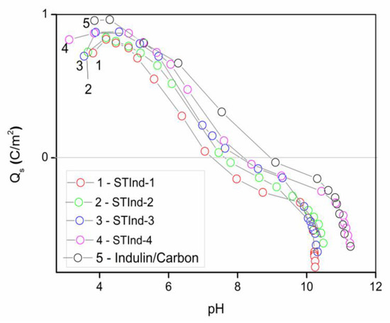 Surface charge density as a function of pH (Qs vs. pH) of carbonized indulin-based biochars.