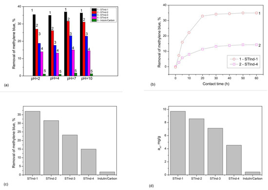 The effect of pH on the removal of methylene blue from solutions with an initial concentration of 12.8 mg/L is presented in Figure 5a. It can be seen that pH only slightly affects adsorption efficiency. The effect of contact time on the adsorption of methylene blue from solutions at pH ~7 on the selected carbonized materials is visible in Figure 5b. It can be concluded that the adsorption equilibrium is achieved in 1 day. The percentage of methylene blue removal by indulin–based adsorbents from solutions at pH ~7 is shown in Figure 5c. It is visible that the change in the value of the removed substance is related to the adsorbent structural and surface properties. Generally, the adsorption data reveal a meaningful increase in the adsorption uptake for materials with iron dust filler (STInd–1, STInd–2, STInd–3, and STInd–4) compared with the sample with pyrolyzed indulin (indulin/carbon) which shows a very weakly developed pore structure. The carbonized indulin samples with the addition of the magnetic filler are characterized by high values of specific surface area (SBET) of ~300 m2/g, while indulin is only 7 m2/g. Taking into account the filler influence, the effectiveness of the adsorption process may be ordered as follows: STInd–1 > STInd–2 > STInd–3 > STInd–4. The differences in adsorption capacity can be related, firstly, to the structure characteristics (e.g., the specific surface area, microporosity, and mesporosity contribution) and, secondly, to the surface properties (i.e., the acid base properties). The share of mesopores in the STInd–1 sample is the highest (0.106), and the micropores share is the lowest (0.894). On the contrary, for STInd–4, the contribution of mesopores is the lowest (0.058), and micropores share is the highest (0.942). The mesoporosity gradually diminishes as the filler content of the initial mixture of blends decreases. It may be that the presence of mesopores facilitates the penetration of the internal adsorbent space by a large molecule of dye.