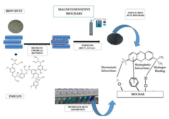 Regarding the adsorption mechanisms of the studied systems (i.e., biochar and methylene blue), one can take into account mainly hydrophobic and electrostatic interactions, but also hydrogen bonding. The scheme of biochars synthesis with the possible mechanisms of methylene blue adsorption is presented in Figure 6. Methylene blue is a positively charged molecule which may interact electrostatically with negatively charged or electron-rich moieties. The formation of hydrogen bonding between hydrogen containing groups (Si-O-H, Me-O-H, C-O-H) and nitrogen atoms of methylene blue can also occur. One can expect that the π-π interactions between the aromatic rings of dye molecules and graphene structures of biochars prevail [9].