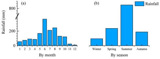 The monthly and seasonal variations in annual precipitation in the study area are shown in Figure 3. It can be seen that the accumulated precipitation on the monthly scale ranged from 10 to 366 mm, with a monthly average precipitation of 133 mm. While June saw the highest precipitation and December the lowest, the precipitation was mainly concentrated from May to October, with an accumulated precipitation of 1247.3 mm, accounting for 78.1% of the total annual volume, and an average precipitation intensity of 6.78 mmd−1. Precipitation on the seasonal scale was concentrated in spring and summer, accumulating 1174.9 mm, accounting for 73.6% of the total annual volume with an average precipitation intensity of 6.39 mmd−1 (including 823.9 mm in summer, accounting for 51.61% of the total annual precipitation with an average precipitation intensity of 8.96 mmd−1, and 351 mm in spring, accounting for 21.99% of the total annual volume with an average precipitation intensity of 3.82 mmd−1). Seasonally, the order of precipitation quantity is as follows: summer (824 mm) > spring (351 mm) > autumn (279 mm) > winter (143 mm). The precipitation intensity order is as follows: summer (8.96 mmd−1) > spring (3.82 mmd−1) > autumn (3.07 mmd−1) > winter (1.57 mmd−1).
