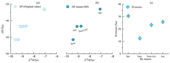 Seasonal variation in (a) δD and δ18O original values, (b) average value of δD and δ18O original values and (c) d-excess value in terms of atmospheric precipitation and d-excess (‰). Red line stands for positive (upper and right) and negative (down and left) standard deviation.