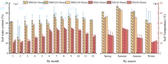 Soil water content and soil temperature in different soil layers at sampling site from January to December 2020. (a) By month. (b) By season. Blue and red line represents standard deviation.
