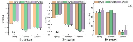 Figure 7 shows the correlations between temperature (ST), soil water content (SWC) and rainfall at different depths of soil, which are all highly significant (p < 0.01). The relatively lower soil water content and higher soil temperature in spring made the evaporative fractionation of the soil more obvious in spring. Moreover, for the evergreen tree species’ growing process and the deciduous tree species’ growing process in their leaf expansion periods, the δD and δ18O values in different soil layers were higher than usual in spring. In summer, the high intensity of daily average rainfall of 8.96 mmd−1 (higher than that in spring (3.82 mmd−1)) reduced the δD and δ18O values in soil water. In winter, as the low intensity of daily average rainfall (3.07 mmd−1) led to a low soil water content and a higher soil temperature than usual, soil water fractionation occurred easily. This is reflected by a higher δ18O value than that in summer and a lower δD value than that in summer due to the lower temperature and minimal plant growth experienced in winter.