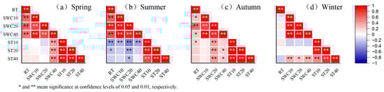 Correlation of soil temperature and soil water content for different soil layers and precipitation levels. (a) In spring. (b) In summer. (c) In autumn. (d) In winter.
