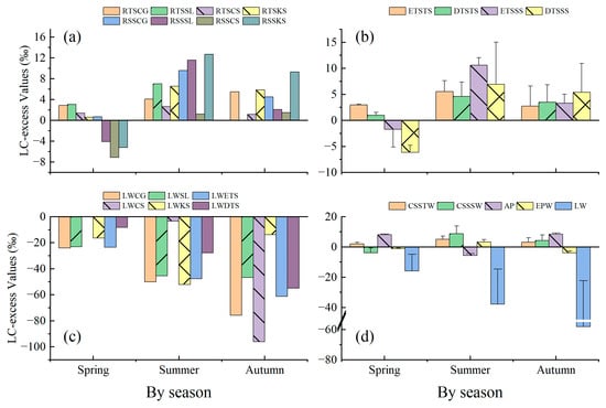 3.3. LC-Excess Distribution Characteristics in Different Water Bodies by Season