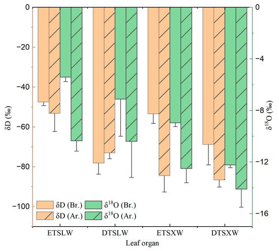 Characteristics of δD and δ18O in xylem and leaf water before and after rainfall in summer. Black line represents standard deviation.