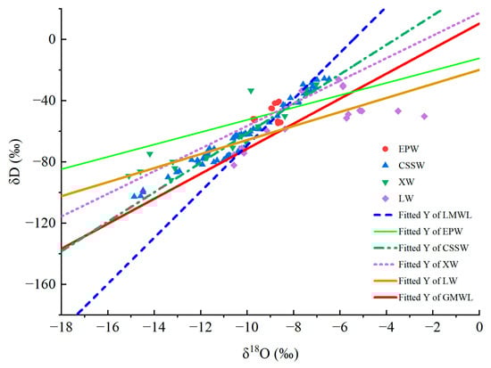 The line-conditioned excess (LC-excess) values indicate the deviation between δD and the local meteoric water line (LMWL) in various water bodies. They reflect the evaporation of various water bodies from the atmospheric precipitation [,]. LC-excess value is calculated with the formula below: