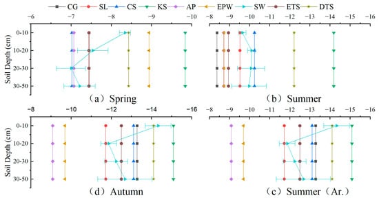 Figure 6 shows the seasonal variation in δD and δ18O values in different soil waters at the sample sites. The results show that the δD and δ18O values of water in the same soil layer varied significantly between seasons. The δ18O value in the soil water of the layers S0–10 cm and S10–30 cm differed highly significantly (p < 0.01), followed by the δ18O value in the soil layers S10–30 cm and S30–50 cm (p < 0.05). All soil layers sampled (S0–10 cm, S10–30 cm, S30–50cm) showed highly significant differences (p < 0.01) in the δD value. The δ18O value of different soil layers varied at different depths, even in the same seasons. Specifically, in spring, the δ18O value of the soil water first increased and then decreased with deeper soil layers. In summer and autumn, it first decreased and then increased with deeper soil layers. As for the δD value of the soil water, in spring, it increased gradually as the soil layer became deeper. In summer and autumn, it first decreased and then increased as the soil layer became deeper.