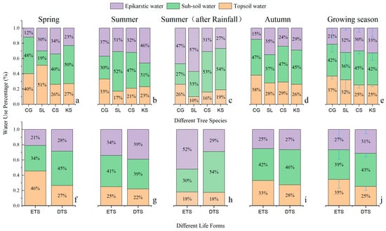 Plant water-use contribution from potential sources by season and before/after rainfall: (a,f) in Spring; (b,g) in Summer; (c,h) in Summer (after Rainfall); (d,i) in autumn; (e,j) in growing season. Blue solid line in e and j represents standard deviation.