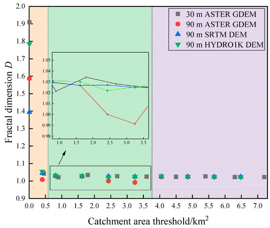 Figure 4 displays the findings of the link between the catchment area threshold and fractal dimension. The four DEM accuracies exhibit the same fractal dimension D trend with catchment area threshold, which can be divided into three stages: rapid decline, gentle fluctuation, and tend to 1. In the rapid decline stage, when the number of catchment raster is 1, the fractal dimension calculated by the three different DEM data has the greatest difference, which is 1.3948 for 90 m SRTM V4.1, 1.5866 for 90 m ASTER GDEM, 1.7845 for 90 m HYDRO1K, and 1.9091 for 30 m ASTER GDEM. The minimum catchment area threshold is 0.0009 km2 for the 30 m accuracy and 0.0081 km2 for the 90 m accuracy. In the gentle fluctuation stage, the change in fractal dimension changes smoothly as the catchment area threshold increases in the range of 0.450–3.600 km2. Decreasing by 0.02 for 90 m SRTMV4.1, 0.0296 for 90 m HYDRO1K, 0.0382 for 90 m ASTER GDEM, and 0.0213 for 30 m ASTER GDEM. The R2 of their fits all reach above 0.9990. Tending to 1 stage, the fractal dimension is basically constant with the increase in the catchment area threshold, and the value tends to 1.