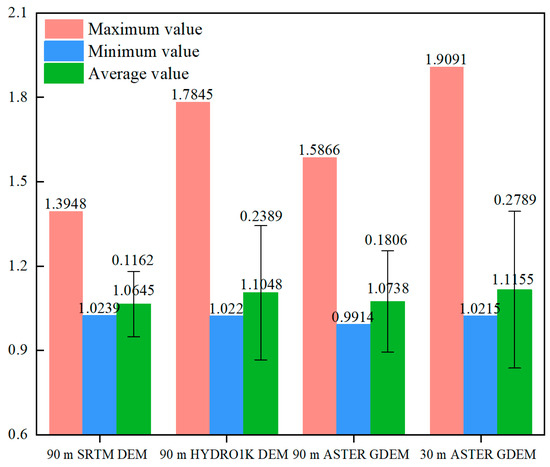 It is found that the vertical accuracy of DEM has more influence on the fractal dimension accuracy than the horizontal resolution. The fractal dimension D increases with the increase in the vertical accuracy of DEM. The influence of DEM data sources’ accuracy on the fractal dimension is SRTM V4.1 > ASTER GDEM > HYDRO1K.