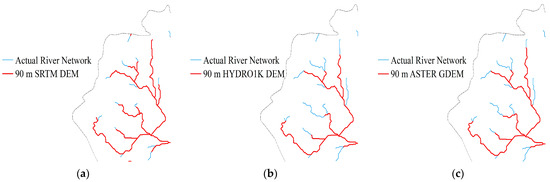 In contrast with the actual river network, the digital river network was created using the best catchment area threshold from the corresponding three DEM data sources. Local fine tributaries indicate the overlaid effect because the mainstem river network is mostly consistent with one another, as seen in Figure 6. The finest superimposed effect with the actual river network is produced by the SRTM V4.1, followed by the ASTER GDEM, while the poorest superimposed effect is produced by the HYDRO1K.