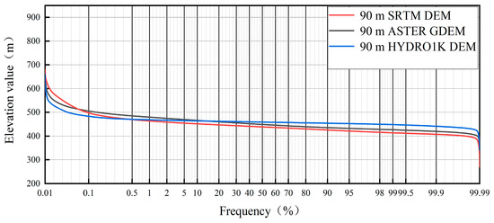 Cumulative distribution of elevation extracted from three kinds of DEM data.