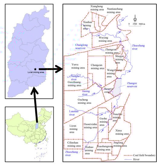 The Lu’an mining area is located in southeastern Shanxi Province and is jointly controlled by Xiangheng County, Dunliu County, Lucheng County, Changzhi County and Changzi County. Figure 1 shows the geographical location and distribution of the Lu’an mining area, including Wuyang, Xiadian, Wangzhuang, Changcun, Yuwu, Guozhuang, Gaohe, Huoerxinhe, Sima and other mining areas. The mining area totals 1182.5 km2 with an annual production capacity of 50 million tons. Surface water is abundant in the mining area, deriving from sources such as the Zhanghe River, Jianghe River, Zhangze Reservoir and Changlong Reservoir. There are almost 181 million tons of coal resources trapped under the water.