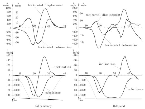 The deformation curve of the surface of the 6206 working face in Wangzhuang Coal Mine: (a) tendency, (b) trend.