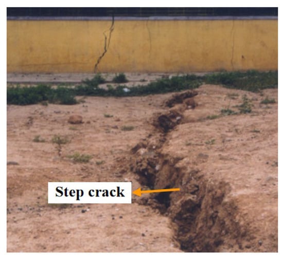According to measurement data, the movement deformation of the surface under fully mechanized mining is significant. For the 6206 working face of Wangzhuang Coal Mine, the maximum subsidence, the maximum tilt threshold, the maximum horizontal movement, the maximum positive curvature, the maximum negative curvature, the maximum horizontal tensile deformation and the maximum horizontal compressive deformation are 4534 mm, 42.4 mm/m, 1060 mm, 0.78 × 10−3 m, −0.98 × 10−3 m, 12.48 mm/m and 18.3 mm/m, respectively (Figure 2). The surface subsidence basin is very steep, and there has been relatively extensive development of surface fissures (Figure 3).