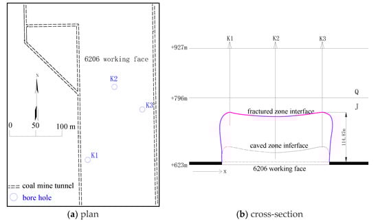 The overburden failure law and development rules of the FWCZ in the Wuyang, Wangzhuang, Guozhuang and Gaohe in Luan Mine under fully mechanized top coal caving conditions were observed [,,]. Drilling holes were made to observe the fissures in the roof of the mining area. Figure 4 displays the drilling holes in the 6206 working face of Wangzhuang Coal Mine. Table 2 shows the height of the FWCZ under sliced fully mechanized mining and fully mechanized mining conditions. Additionally, the operation was not found to be affected by adjacent operations. All the mining seams are located in the lower Permian 3# formations.