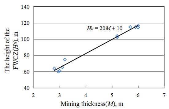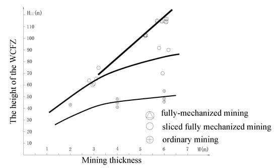 Relation between height of FWCZ and thickness of the same coal seam under different mining conditions.