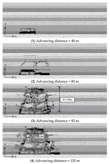To build the model, thin rock strata with similar properties were chosen and combined in modeling. The bedding among different rock strata was pre-set, and the elements were set as homogeneous isotropic collinear elastic brittle bodies in the system. Each rock stratum was non-homogeneous, and the mechanical parameters (e.g., elasticity modulus and compressive strength) all conformed to the Weibull distribution. The simulation results for overburden failure in the full-seam mining working face in Lu’an Mine under fully mechanized mining conditions are shown in Figure 6.