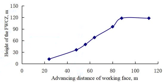 The height of the FWCZ under fully mechanized mining conditions was significantly greater than those under ordinary mining and sliced fully mechanized mining conditions [,]. The maximum heights of FWCZs under ordinary mining, sliced fully mechanized mining and fully mechanized mining conditions were 49.6 m, 83.9 m and 114.67 m, respectively. Given the same conditions, the maximum height of FWCZ under fully mechanized mining is 1.37 times that under sliced fully mechanized mining conditions and it is 2.31 times that under ordinary mining conditions.