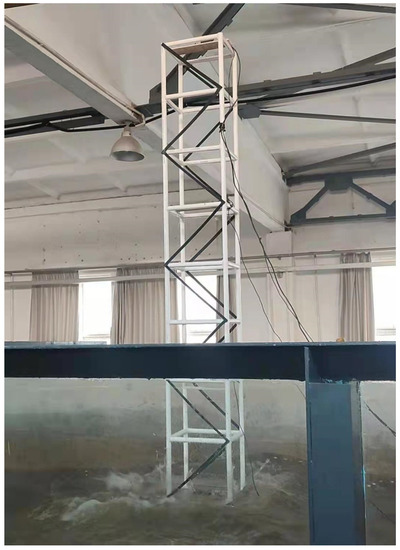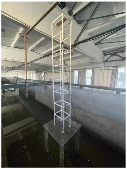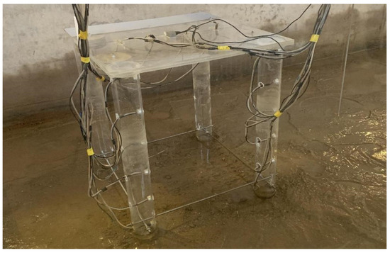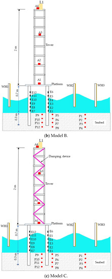 Three models were constructed for this experiment (as shown in Figure 2). The first model (A) was used to test the dynamic response of the jackup offshore platform under waves, and the second model (B) involved installing a tower model on the platform of model A, which was used to investigate the coupling between the jackup offshore platform, the tower, and the seabed foundation under wave impacts. The third model (C) involved installing a damping device (i.e., diagonal bracing using rubber rods) on model B, which was used to compare the tower on the platform with and without the damping device. Figure 3 shows the offshore platform model in the sandpit of the flume. The depth of the pile legs embedded in the seabed foundation was 0.3 m, while the part above the mud surface was 0.7 m. The four pile legs were arranged at the four vertices of the platform in a square shape at the bottom of the platform, with a spacing of 0.5 m. Based on the previous results of physical model tests, the offshore platform and pile legs were made of Plexiglas in this model test [38], which ensured that the actual scale of the elastic modulus was close to the designed scale in order to get reasonable dynamic response results of the jackup platform under waves. The density of the Plexiglas material used for the model tests was 1780 kg/m3, and the tensile modulus, flexural modulus, and shear modulus were 25 GPa, 9.3 GPa, and 7 GPa, respectively.