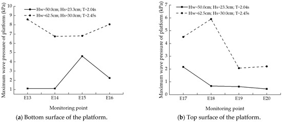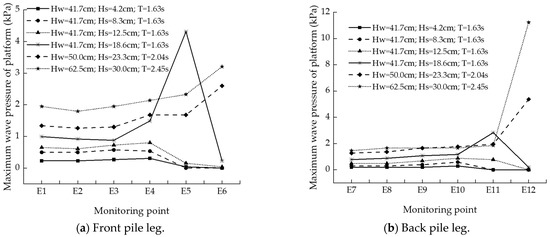 The depth of the water has a significant effect on the wave pressure on the platform; when the water depth was less than or equal to 41.7 cm, the wave pressure was only on the leg of the pile, and the wave could not touch the upper and lower sides of the platform. As shown in Figure 8, when testing model A under waves of large wave height, the water depth was 50.0 cm and the waves began to touch the lower side of the platform. When the water’s depth reached 62.5 cm, the wave generated obvious crossing while touching the side of the platform. Under the waves of large wave height, the maximum wave pressure on the platform’s panel structure was at the lower side of the platform panel, and the maximum wave pressure on the pile leg structure was at the upper end of the wave-facing side of the pile leg.