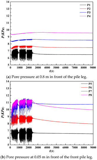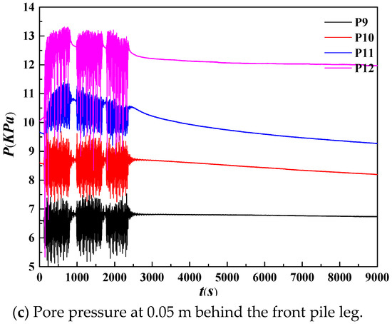 Under waves of large wave height, the wave is blocked by the platform’s surface, causing a pile group effect, thereby increasing the water body’s energy. The experiment results show that the effect of waves on the platform is significant, and the platform exhibits obvious shaking, along with surging, pitching, and rolling. The platform produces reciprocating motion as it shakes; combined with the wave impact, the pore pressure at the lower measuring points (i.e., P7, P8, P11, and P12, as shown in Figure 10) first increases and then gradually dissipates with time, while the soil near the pile leg becomes soft and the lateral soil resistance decreases. The mechanism of pile instability of the offshore platform under waves of large wave height is revealed, which is consistent with the cause of the drilling platform accident in the Shengli Oil Field in China [39].